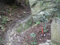 数分歩くと道の左手に、「この下 車道へは行けません」と書かれた立看板と、その下、木の根元辺りに「へんろ道 横峰寺」「第六十五一番 香園寺へは大師堂**」と記された案内がある。 この案内がよくわからない。「この下」」とはどちらを指すのだろう。事をややこしくするのはこの2丁石から左に踏み跡と見えないこともない筋が残る。実際その踏み分け道を200mほど進めば、明治の神仏分離の折、横峰寺の境外にお堂を建て本尊などをそこに避け、後に大峰寺と称した場所に出るようだ。 で、案内の意は、この大峰寺跡へ向かう道を辿っても車道(平野林道)には繋がらないという注意だろうか。それとも単に湯浪から上ってきたこの坂を下っても車道(平野林道)に出ることはないという注意だろうか。